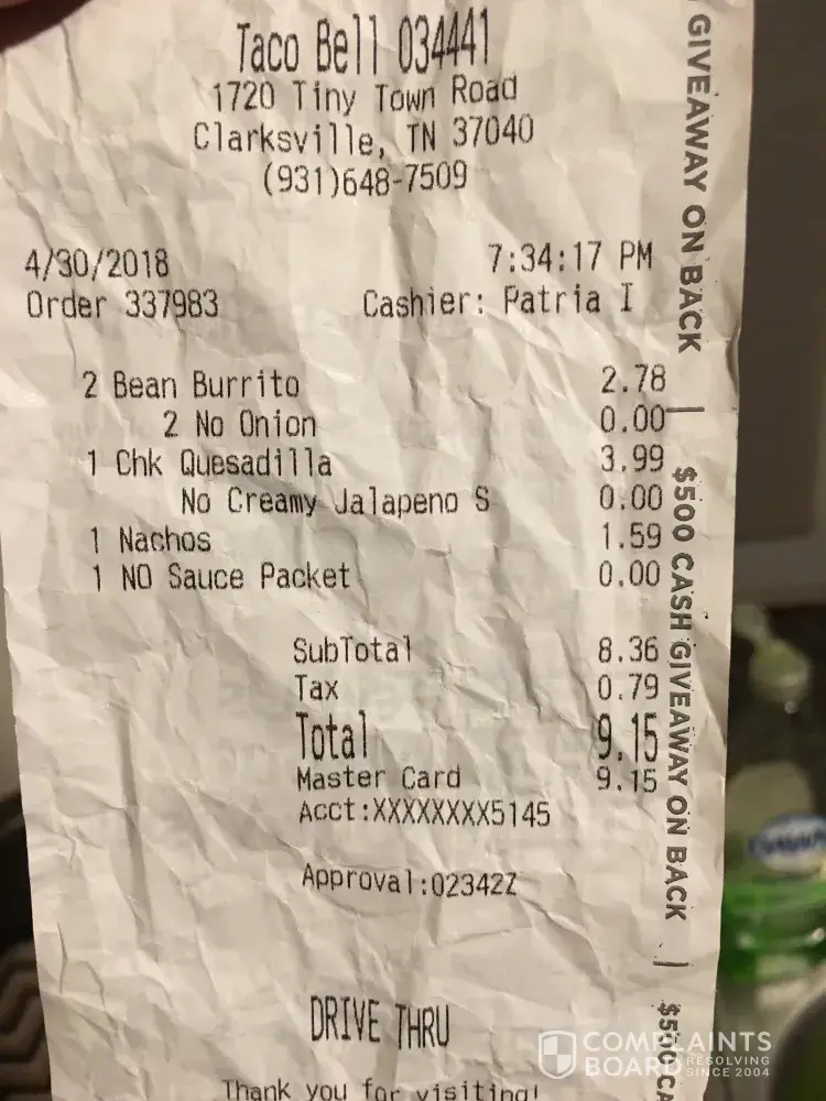 My experience at the taco Bell on 92ndst between cactus and shea was the worst I have ever had. When I walked in there the lady at the register was rude. She made no contact to say hi how can I help you, she just kinda stood there. I went ahead with my order and advised that I do not want any cheese on the chalupe that i ordered because my friend is allergic to cheese. I told her several times I didn't want cheese on there. I paid for it and she grap the cash from my hands as I was telling her I had change to give to her but she didn't wait and then when I did get the change, she grap that to and she had to count it out what the correct amount was because she hadn't typed it in which took her awhile to do. She didn't give me a # so I would know what # my food was and I never recieved a reciept. So i figured it would come in the bag. When I finally received my order to go, I checked to make sure everything was there and it was but when I got back to work, there was no reciept in the bag, and when my friend opened her chalupe there was cheese in it and because I was on my lunch hour there was no time for me to go back to work so she was not able to eat it, she just threw it away. The other tacos that were ordered were correct with the stuff on them however they did not tast right...there were a little to soggy on the bottom.