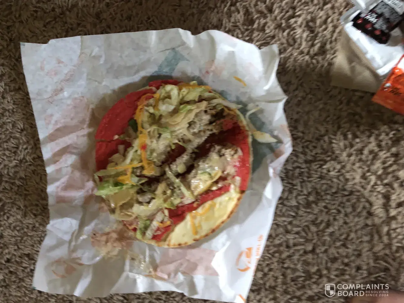 Every time I get a Mexican pizza, the top of box is always smashed don't on to the top of the pizza and all the cheese gets stuck to the top of the lid. Well this time I asked for extra cheese and I got this instead... there is always something wrong at this Taco Bell