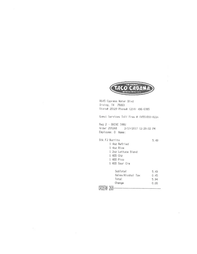 I went at my lunch time around 12:29pm and ordered a Steak Fajita Burrito thru the drive thru at the location in Las Colinas, TX 8645 Cypress Water Blvd. (Order #268)