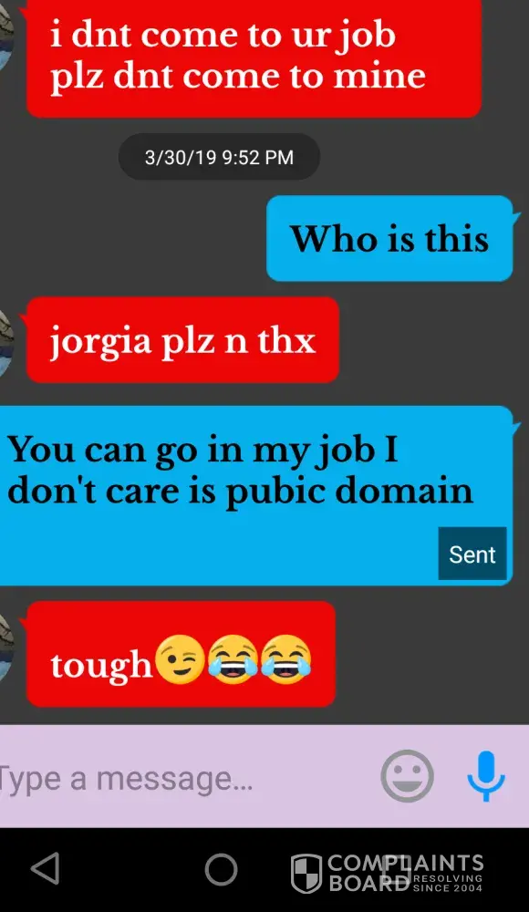 Started on 3-30-19 went into restaurant ordered dinner. As I was om way out I get text messages from Jorgia Avery the assistant manager not yo come to the store. My daughter is now being harassed by text while in school about keaping me away from her job. I reported to to manager but dont think anything got resolved so im taking it this to someone care...
