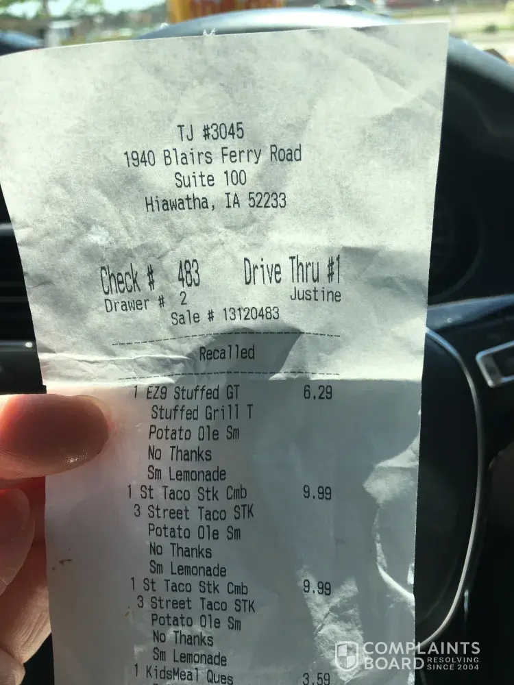 I ordered 2 steak boss bowls. I went threw the drive thru got home there is no steak on them. I don't have my receipt because she didn't give me one. Even though I said yes when she asked if I wanted it. It happened 8/31/2022 at the taco johns in cloquet Minnesota 55720 around 2pm. I paid $16.81. My email is defoe91@gmail.com