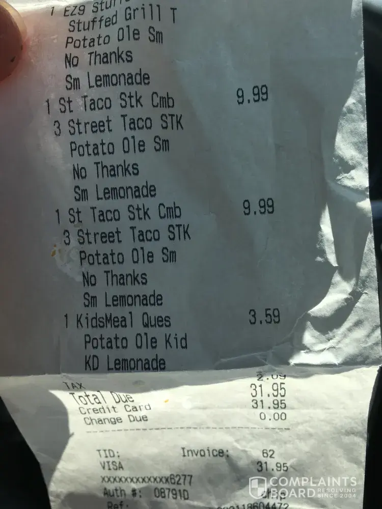 My 1st time to try taco John's on taco Tuesday. Was so very disappointed. I ordered 2 /.89 tacos and small potato ole. I specifically asked does the cheese come with so I also ordered a side of sour cream. I noticed my receipt charged me for cheese also. I asked why, they said we made mistake. The tacos were pittyfull. Taco bell for me. Not happy