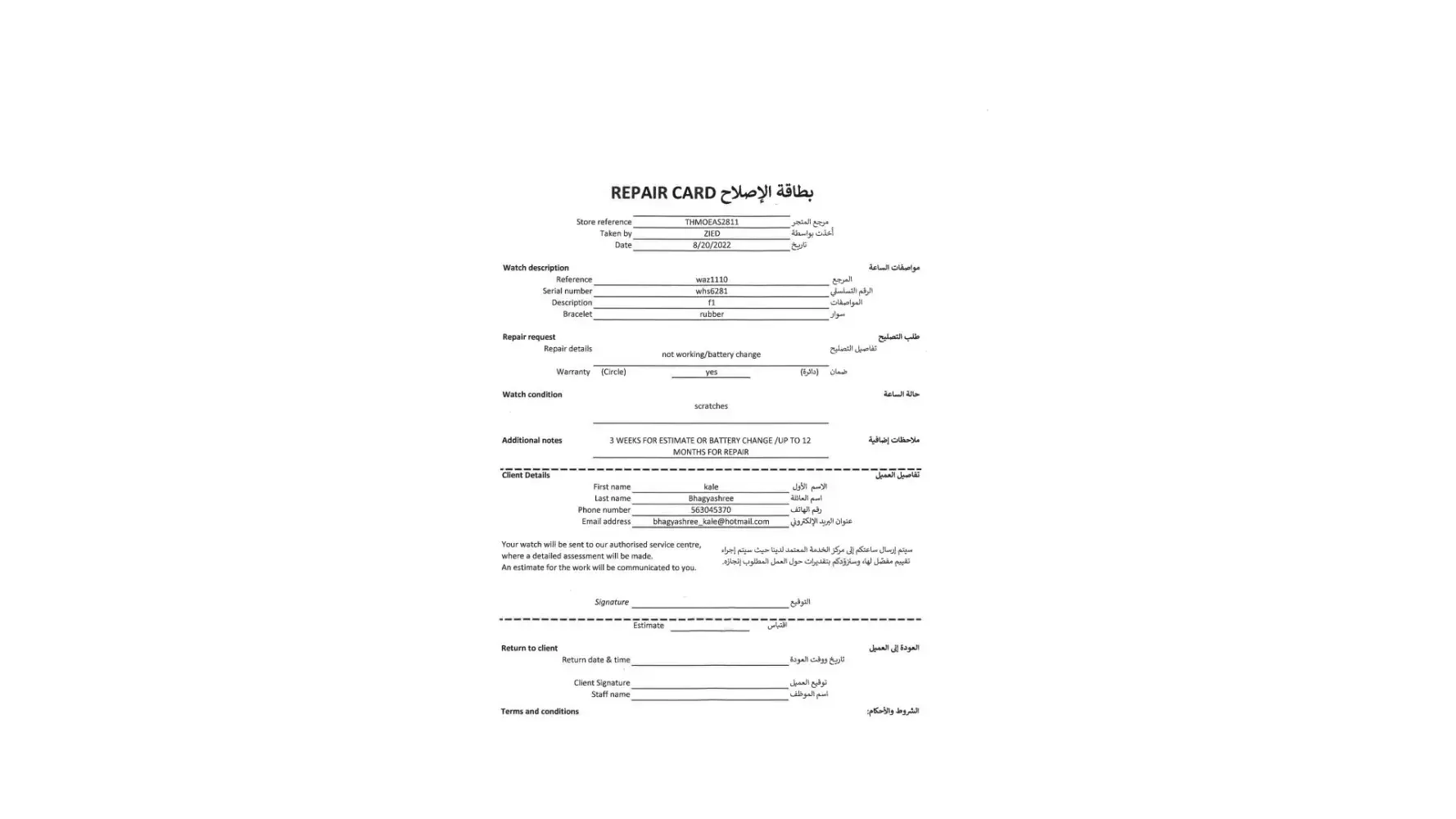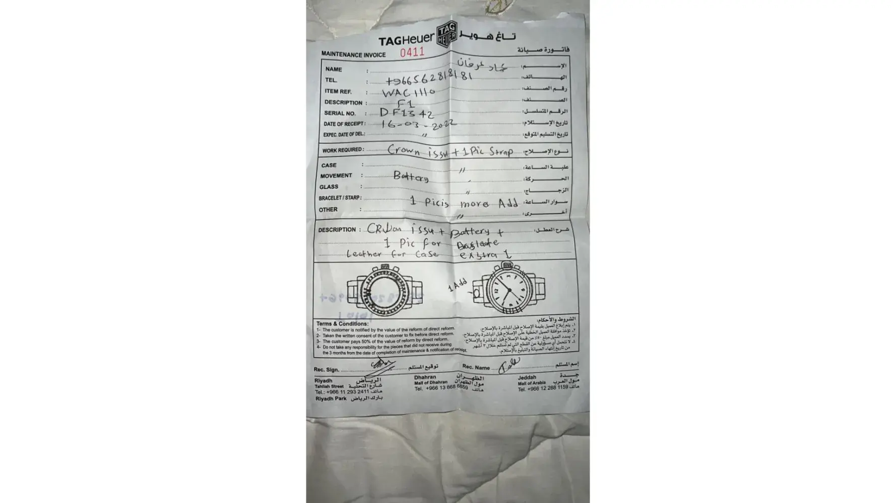 I handed over my watch for minor repair on 16 March 2022 and the person in charge called me after 4 working days to confirm the 618 SAR cost for repair and I did confirm my acceptance in return during the same call. Nonetheless, and since then I am following for my watch and I always get the same reply we shall contact the after sales and come back to you and you shall receive your watch soon which never happened to present time. (Attached in photos the maintenance invoice for your kind reference and review).