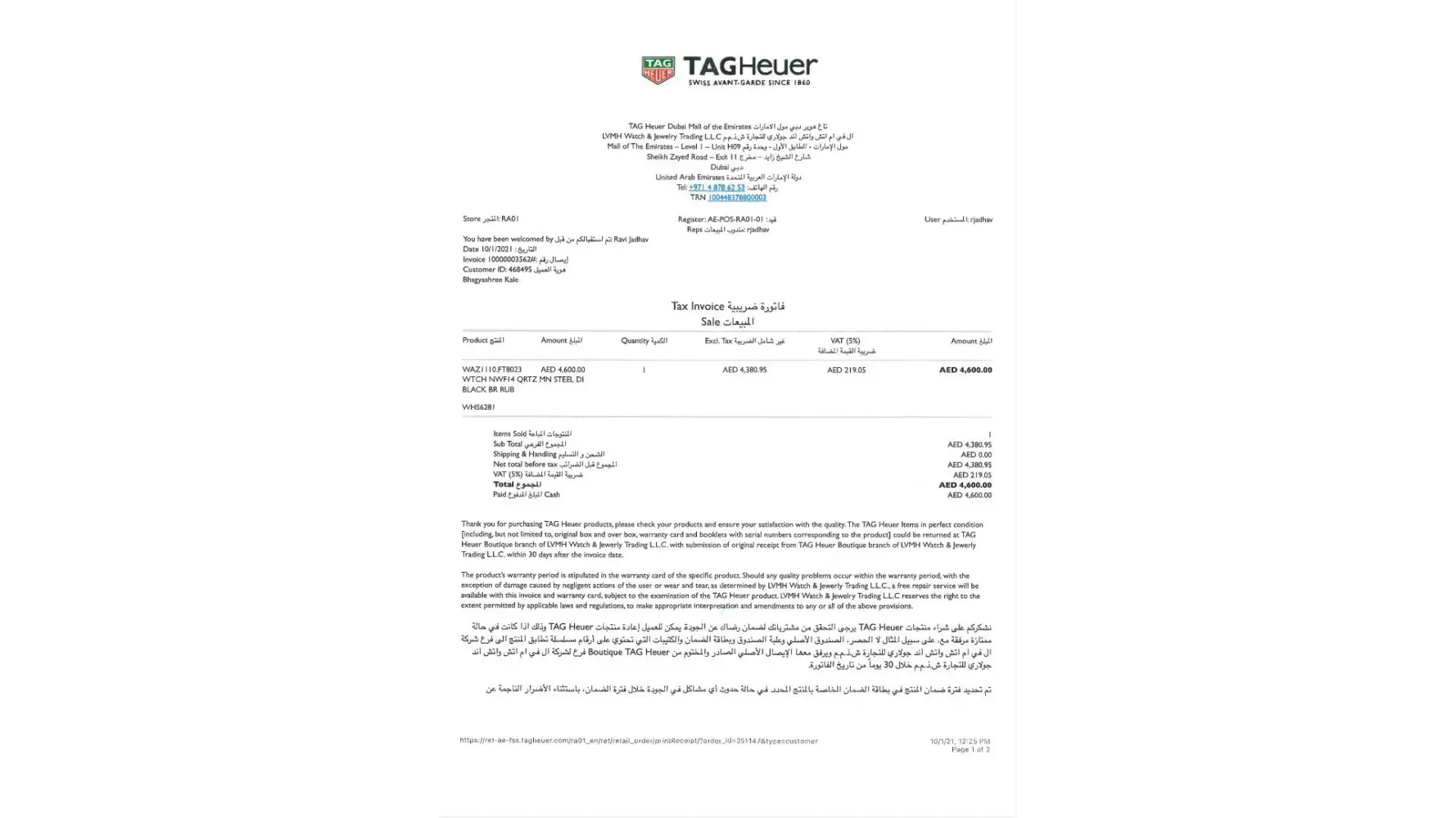 I had purchased this watch on 1st October 2021 from Mall of Emirates store in, Dubai UAE. Attached is the invoice