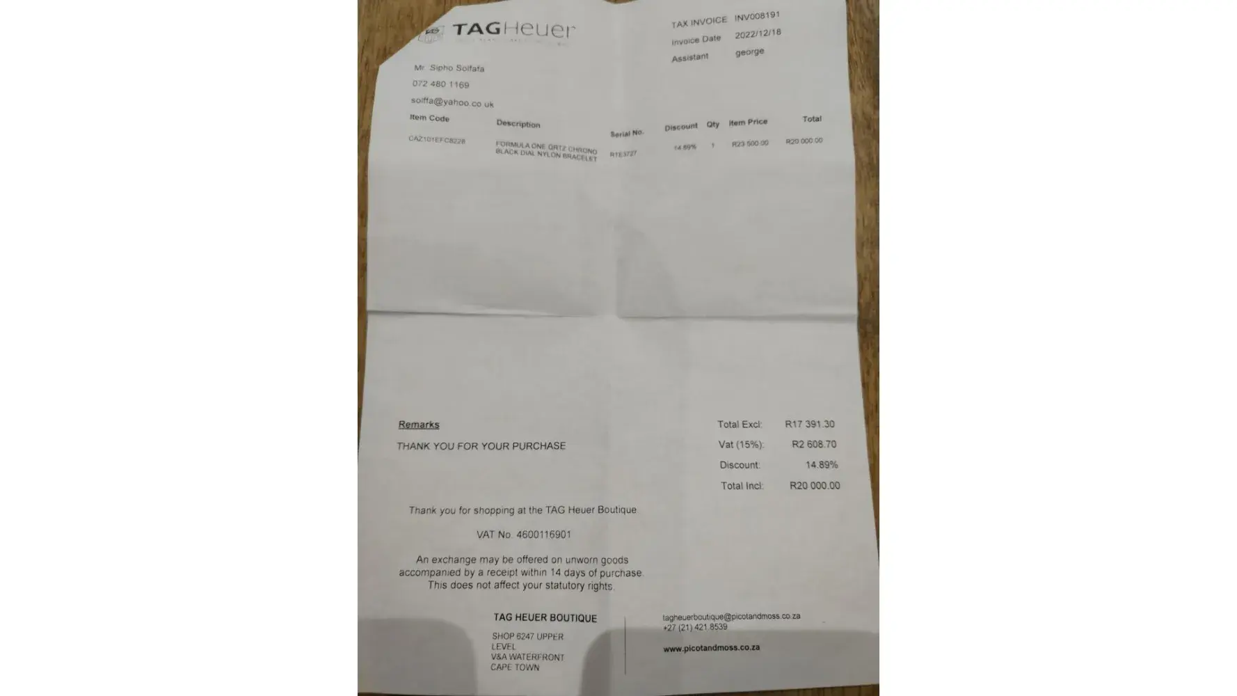 On 18/12/22 @ 18:58 I bought a Formula One Qrtz Chrono Black Dial Nylon Bracelet at Tag Heuer Boutique V&A Waterfront in Cape Town. I showed the lady Assistant that attended to me that the nylon bracelet was a bit short for my wrist. She had no solution and I wanted to try it first. On 28/12/22 I went back to the store and again showed the same lady the issue (see attached pic). The lady was not friendly, she told me 2 wait until 3/1/23 for a call, also that I'm not her client.