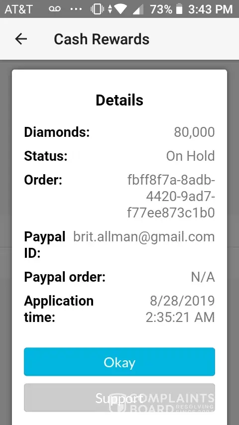I did a cash out diamonds for cash 3weeks ago it had me enter my PayPal now it says on hold for the past 3weeks now what do I do