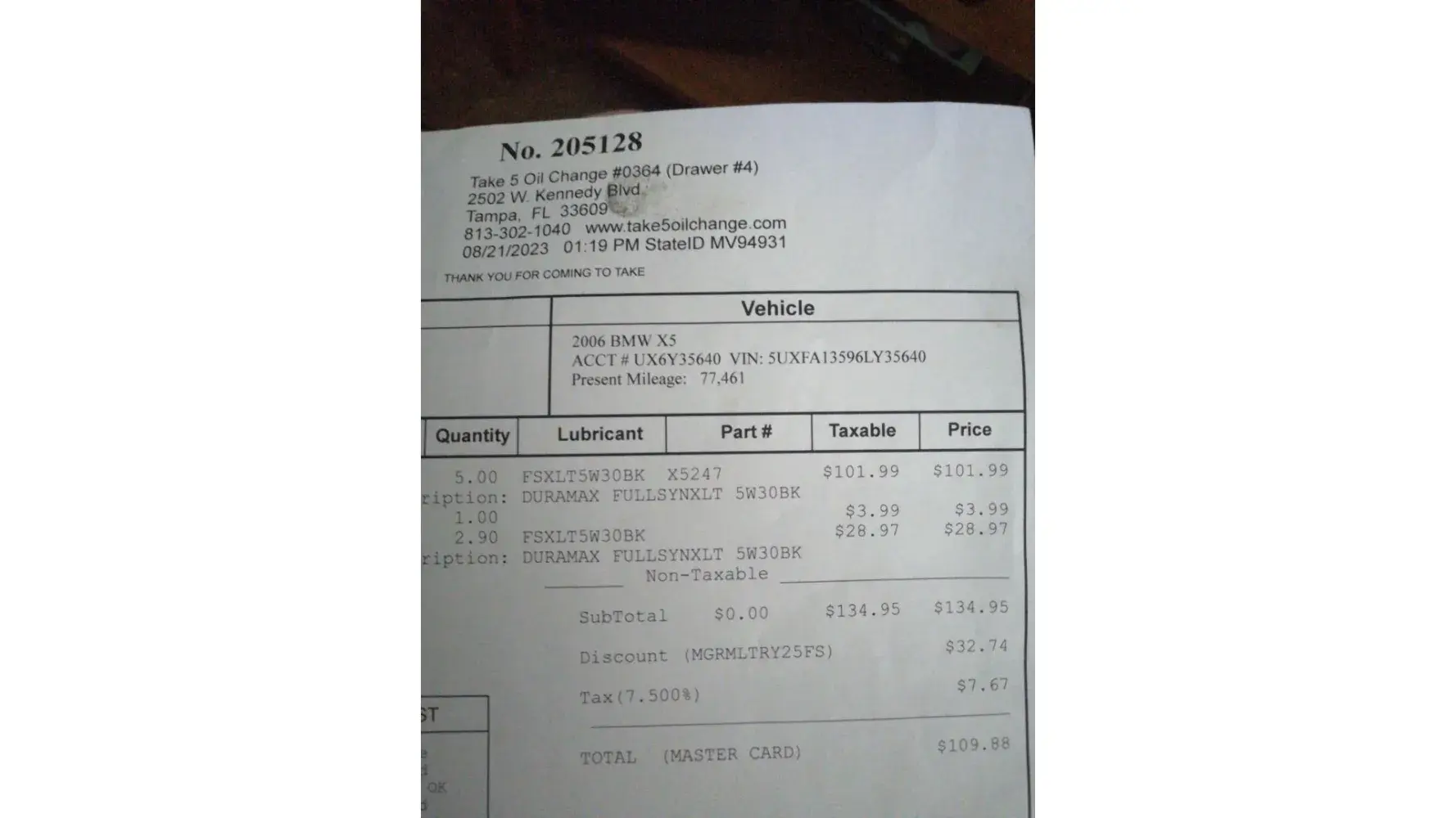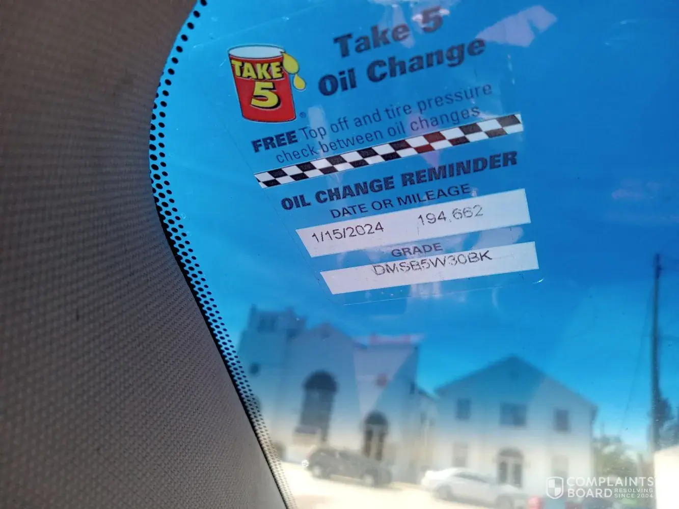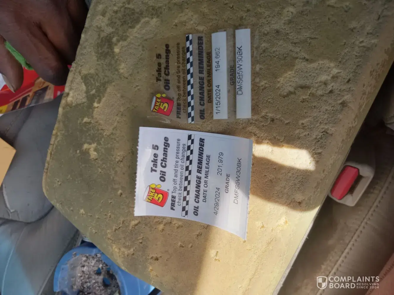 I got an oil change Sept 1st from Take5 Oil change right near home depot, Baytown Texas. My housemate was with me. I drove off, came home and packed car to leave on trip.