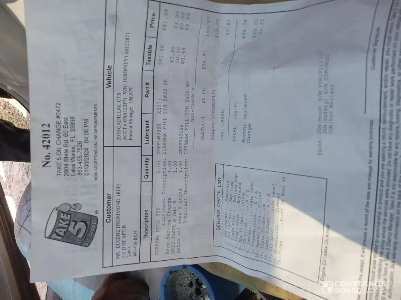 - We conducted a search on social media and found several negative reviews related to Take 5 Oil Change. These reviews may indicate issues with the company's products, services, or customer support. It is important to thoroughly research the company and its offerings before making any purchases to avoid any potential risks.