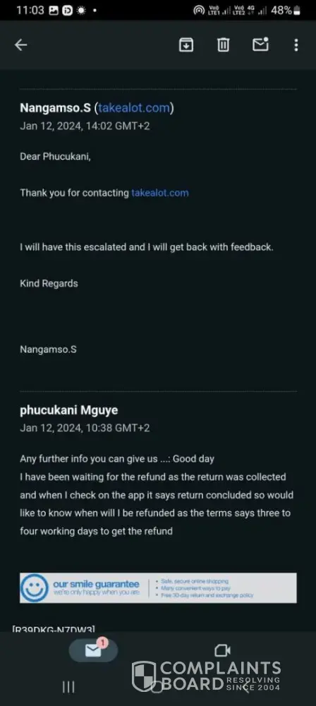 2024/01/12 10h08am I checked my takealot app it says my return was concluded yet they kept me waiting because the app said its concluded, according to my understanding i should be paid back the money but they never did i emailed to ask whats the feed back since they have concluded the matter they replied saying they have escalated the matter they will revert to me, I patiently waited for them to reply me.