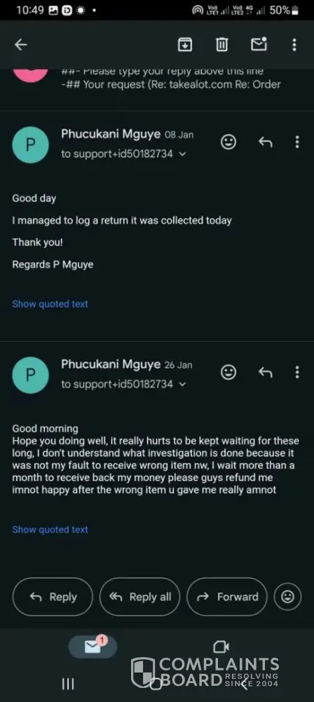 2024/01/08 the driver came to collect the return and I waited for the reply from date of collection till 2024/01/10 I emailed them asking for a feed back from them as I claimed that I want my refund I don't want their product anymore and they replied same day at 09h58 saying I should provide them with order number so that they can assist me.