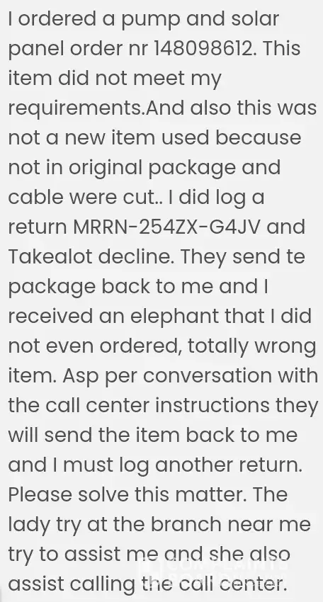 I did order a brushless pump and solar panel for my fish pond on 4 March 20 2024 order nr [protected]. First of all If I buy something I expect it to be in a proper package. Suspect Item was used or returned by another customer. The wire were cut because one wire was shorter than the other one. 2nd the item did not meet my requirements.The item is suitable for a fountain and not a fish pond. I log a return that was rejected because of my reasons. Takealot was suppose to send the item back to me and as the call center request I have to log another return. The item returned to me was a stuffed elephant. I never order an elephant. And ever since the matter was not solved. I am a loyal customer. For more detail send me the email address so that I can send you the details of the emails sent.