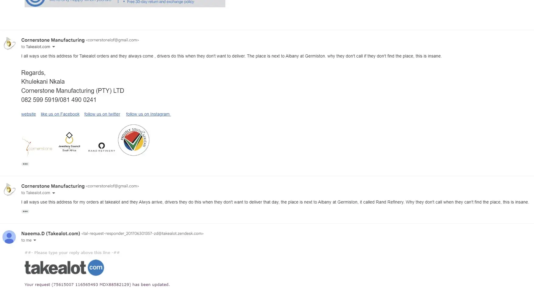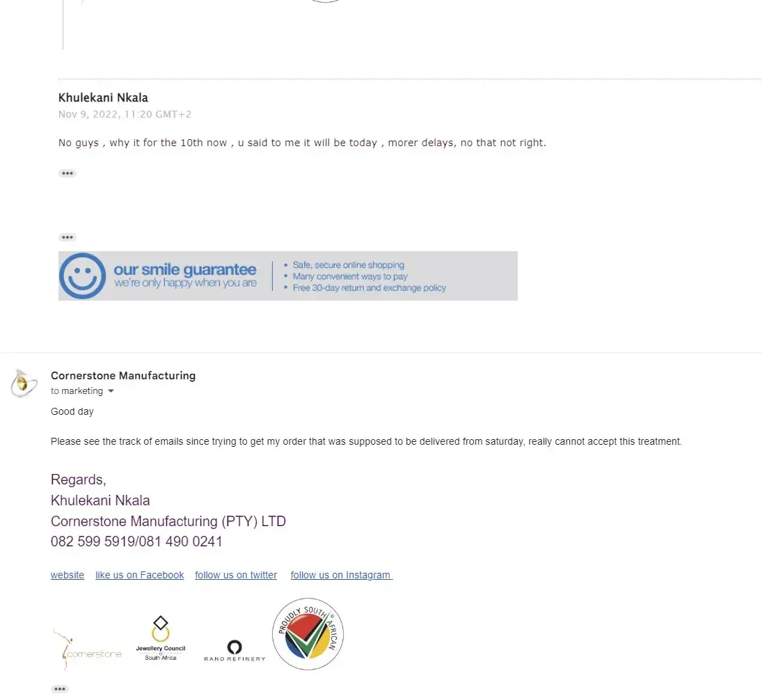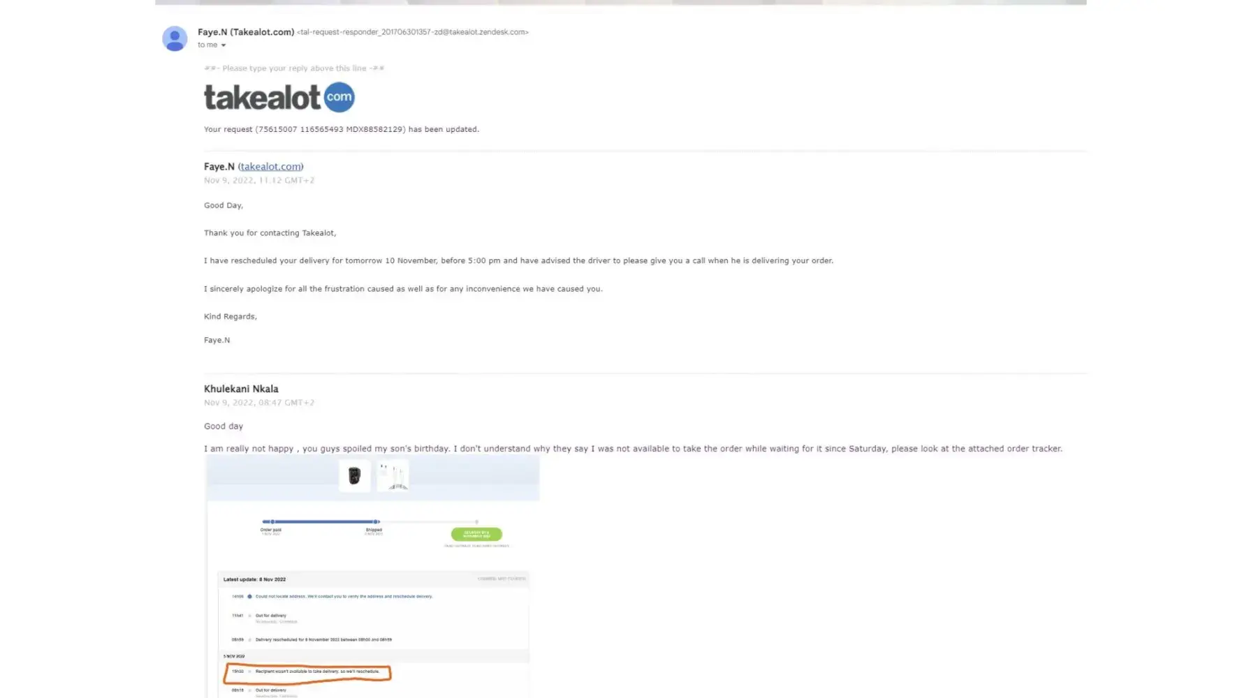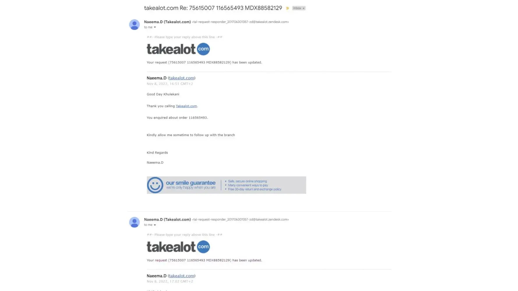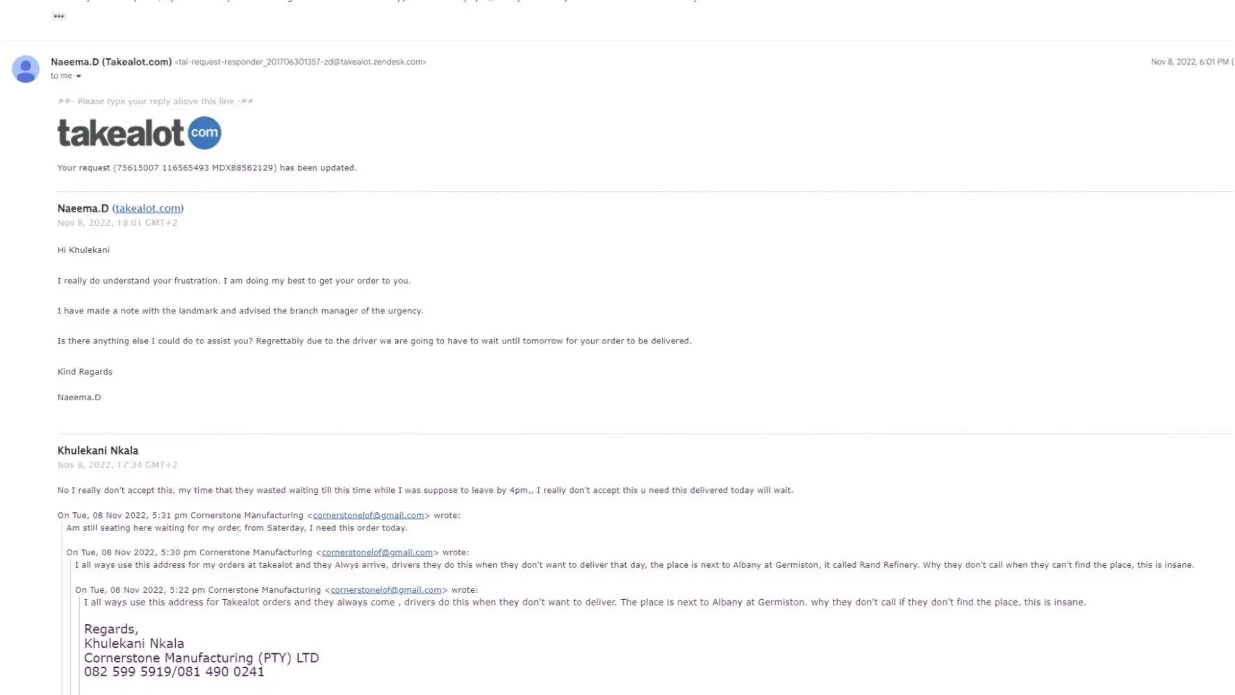 On 23 October 2022 received an email from Samantha.m saying I will escalate your response to our order fullfilment team. That is the last we have heard from takealot.
