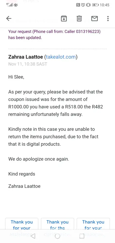 finally received my coupon back, which i used to purchase a few items, i still had R400 and some change left as the stand was a 1000. i sent email regarding the remainder of the funds, and i was told since i didn't use the whole amount, it has fallen off, so i cannot use it any longer and the is nothing they can do.