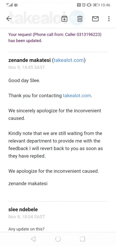 this happened more than 3 times, so i decided to take the stand myself to Takelot in North Beach Durban, Kieth assisted me and helped send it i through to head office.