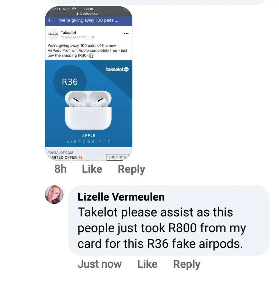 I have bought a pair of airpods for r36 on your facebook page it took me to checkout and it went off the bank... R800 went off my account I immediately called my bank and they informed me it is a overseas account that deducted the money of my account and I need to close my card as they will now repeatedly take money from my account, I checked yesterday and today and that add is still on there page... What must I do now you can look I am a super customer but now more than upset! Please assist