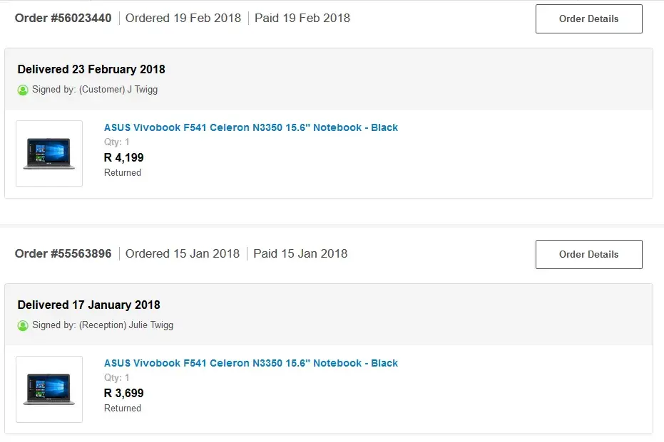 I phoned Takealot again, and had to explain everything in detail to another agent. He told me they only received the credit note 2018-10-18 and they didn't know where my laptop was. He promised me he will speak to his manager regarding the ‘mess' and phone me back ASAP.