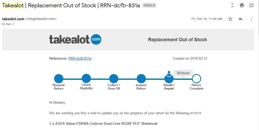2018-10-22 I emailed Takealot for feedback regarding the replacement of my laptop. I received a response from Austin Lategan: "Kindly note that I will need to follow up with our DC and as soon as I receive feedback I will contact you right away."