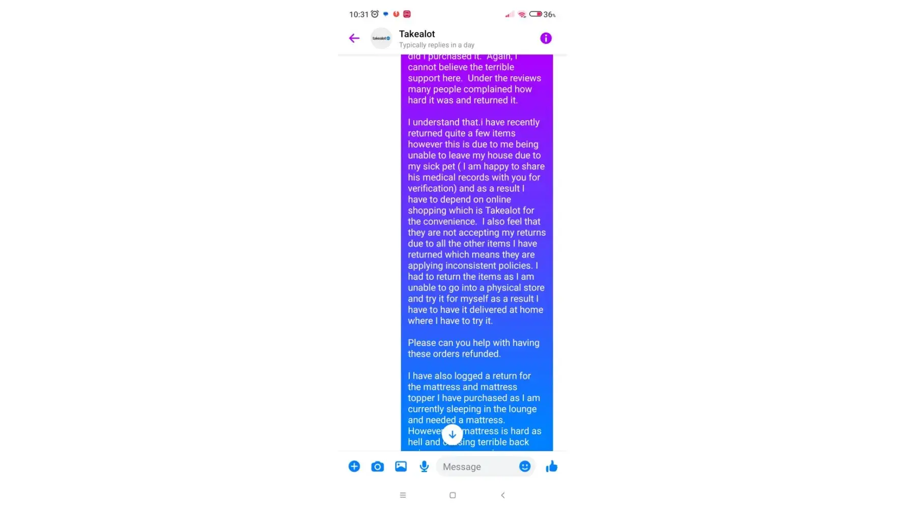 My dog has cancer and I am unable to leave the house hence I have been shopping online via TakeAlot. I purchased a pet carrier as I thought it would be convenient to put my dog in since he can hardly walk. The pet carrier was delivered on sat evening 7 oct 2023 and I opened the item seal on 8 oct 2023 at 3pm to view it. I only had a look at the bag with all the other accessories still in their packaging. Upon viewing the bag, I realized that the opening is too small for my dog even though the description on the website said its for a large dog (I had a look at the reviews on 17 oct and others have complained that it is not for a big dog as well). I put it back in its packaging and logged a return under the same product return code that I have returned many opened items for which I was refunded. The item was not used at all, only viewed. The item was returned and they declined my refund stating the seal was broken. I phoned customer service a few times as well as asked to speak to a manager, who by the way, was the most rudest manager I ever dealt with and pity that TakeAlot does not know anything about customer service. The item has now been returned back to me today with very untidy repacking so I am sit even sure of they returned a brand new product to me. They are being spiteful as I have recently retuned quite a few items as I a dependent on online shopping as I am unable to leave the house due to my sick pet and as a result. I have returned quite a few items under the same return code for which it was accepted however they are now applying inconsistent policies and I should not be forced to keep a item I did not use and cannot use because the tape was opened.