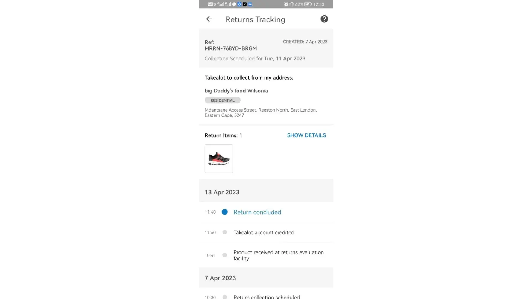 I have log return of my shoes it was 7th of April, then when I do follow up I found out that is listed as concluded at 13 April but I have not heard from anything from them.