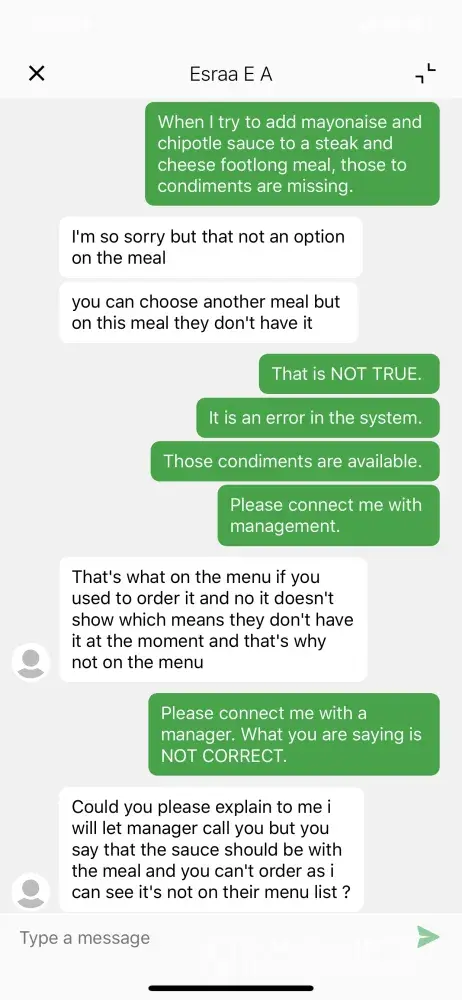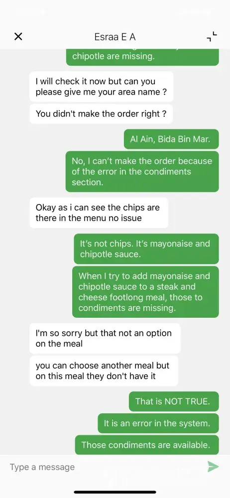 As a result, I had to contact another agent for help -- Esraa E.A. I had to retype everything to reexplain the problem. Esraa said that mayonnaise and Chipoltle sauce are NOT options for the Steak and Cheese Footlong Meal. This is NOT TRUE. I have ordered this meal MANY times. These items are missing because of an ERROR. Esraa E.A. said that if the items are missing, that means that "they don't have it at the moment". This also is NOT TRUE. She didn't even try to help at all with fixing the problem. I asked Esraa E.A. to have a Manager call me so that we can place the order. I still have NOT received a phone call to help with our order. As a result, we are DRIVING to the Subway Restaurant to place the order in person. Because your agent Esraa E.A. did not help. My family and I spend A LOT of money with Talabat. We order from Talabat almost EVERY DAY! And the one time we need help from an agent, we receive HORRIBLE service. This is NOT acceptable. I am contacting the Talabat Corporate Offices. I am including screen shots of the chat as proof of the POOR service from Esraa E.A.