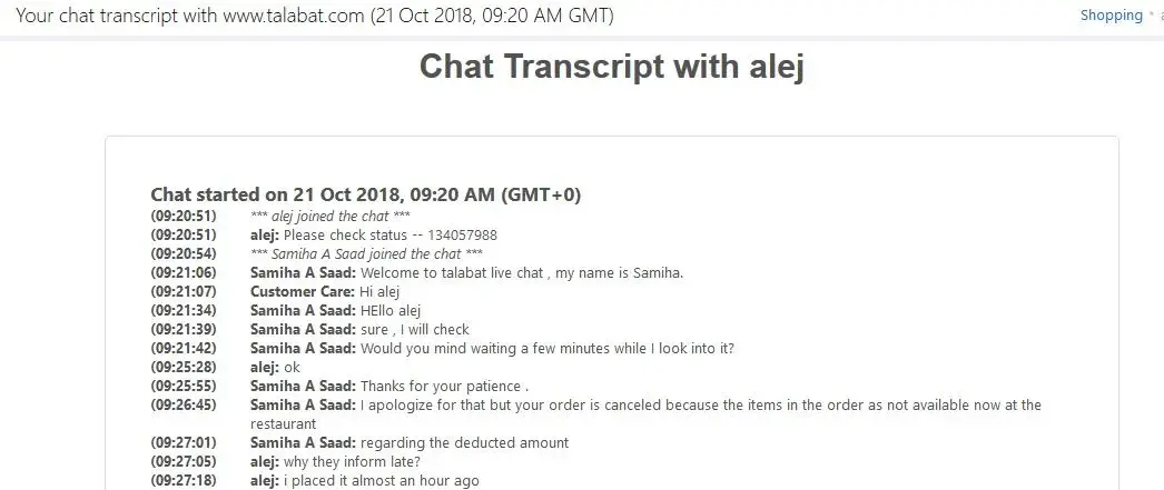 On 21-Oct 18, Talabat cancelled my order due to restaurant says that my order is out of stock. This was not reflected on their site and they only inform me when I followed up which is 45min after I placed the order.