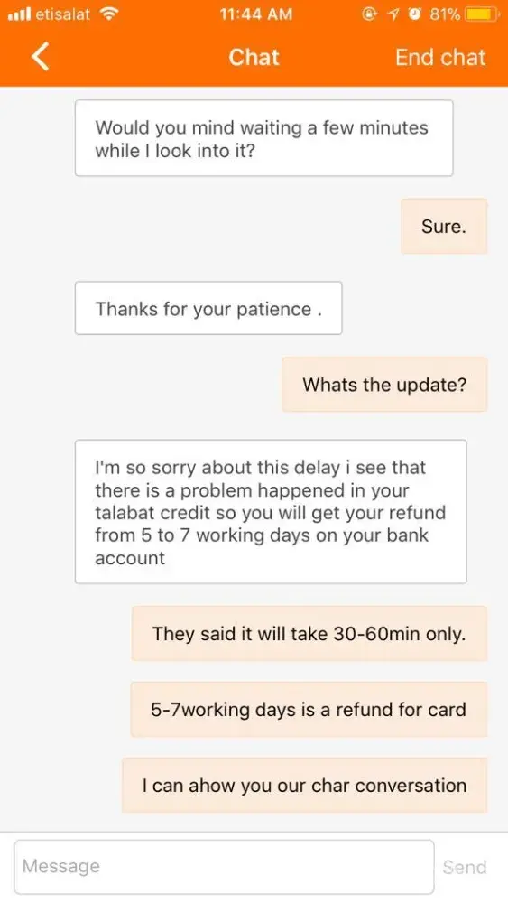 I ordered Texas Chicken on 13, my order was approved and charged me instantly on my card. At the time of delivery I get a call from the restaurant that they can't deliver and there goes my lunch break. So now I contact Talabat regarding this matter it took the agent 20 mins to confirm what I had already told him and he finally believed me that my order was cancelled. Because of this experience I decided not to use Talabat again and stick to Zomato and decided to ask for refund, the agent said if I accept Talabat credits I will get in 15 mins but for refund I have to wait 7 to 10 days, I chose refund and that's that. I fill a contact us form on 11th day regarding my refund but no response, then contacted them on live chat on 23rd and I was promised that I will get a call which never happened.