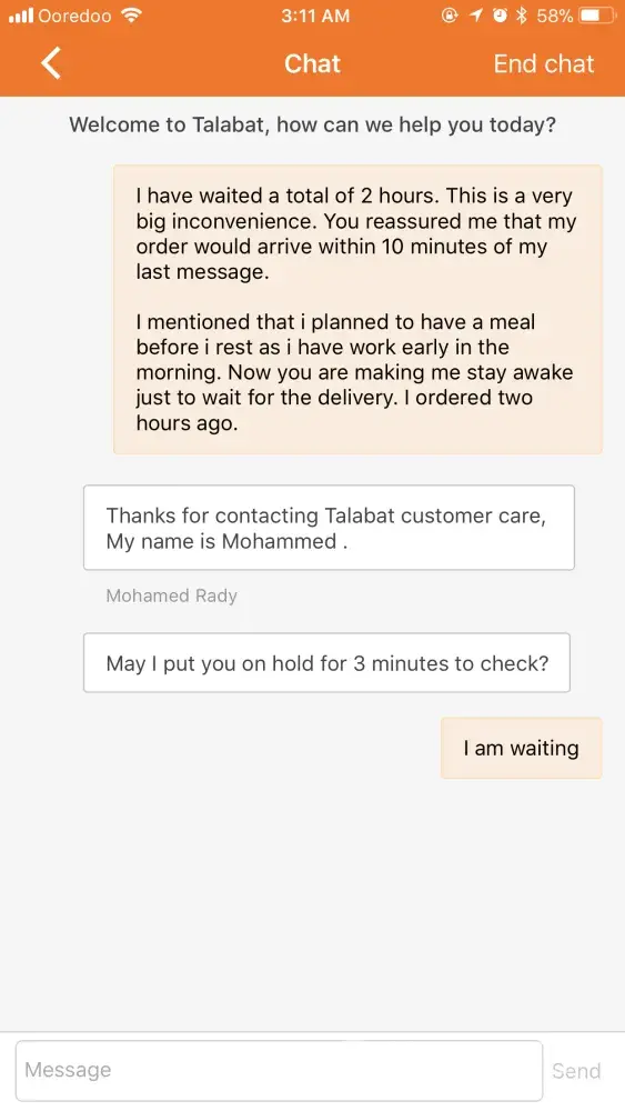 It has been almost 3 hours and still no food in sight. Talking to their chat bot is like talking to a brick. They have no edit option on the order. They could learn some ecommerce lessons from EatEasily which has consistently fast reliable service seriously. Shame on me for trying out another service. I should've checked out reviews before I tried out Talabat. I am so freakin hangry now. They should know more than to piss off hungry people!