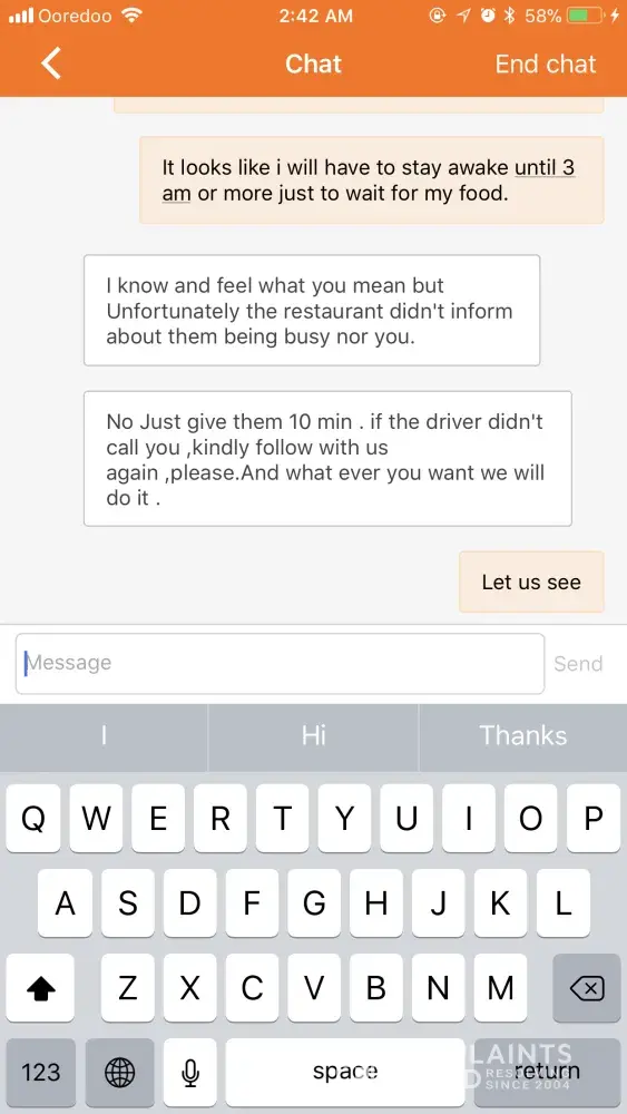 for 2 consecutive days i submit orders on talabat app and waited for more than 2 hrs to be delivered .. called the chat agents they do absolutely nothing and end the chat by saying i ll apply a compliant for the complains team to calls you then nothing at all and no one calls back