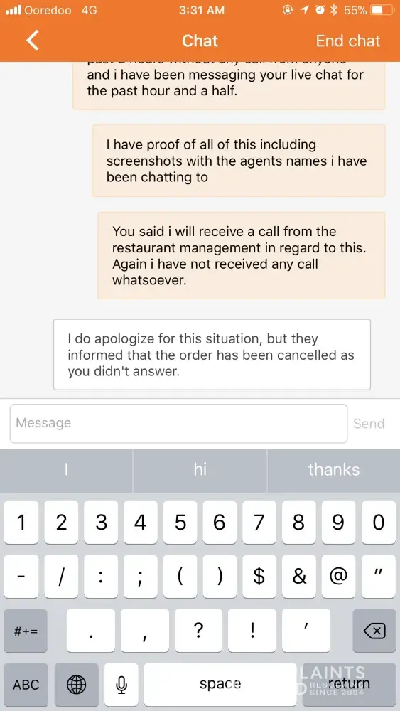 I messaged again saying that I still did not receive either the order or a call from the restaurant manager.