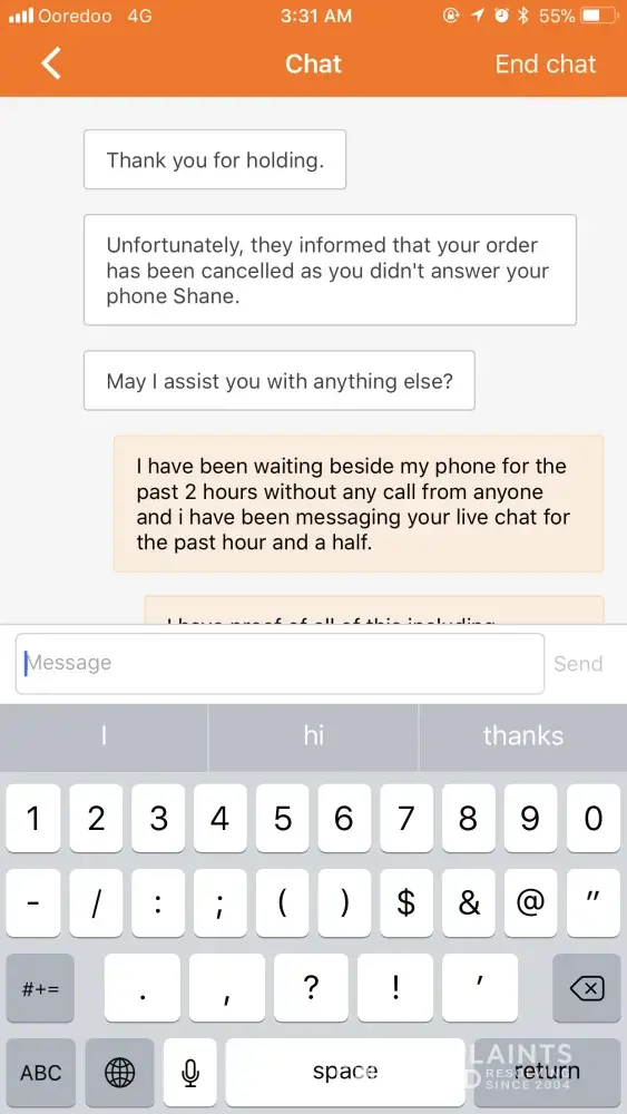I said that was impossible as I had been waiting for two and a half hours beside my phone, using it, messaging the live chat agents.