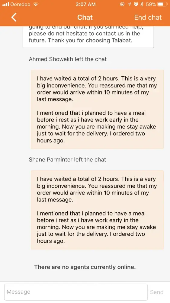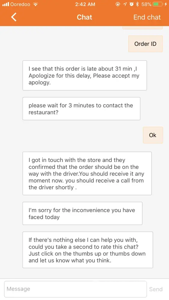 I waited for another half an hour and still did not receive the order. Again, I messaged an agent.