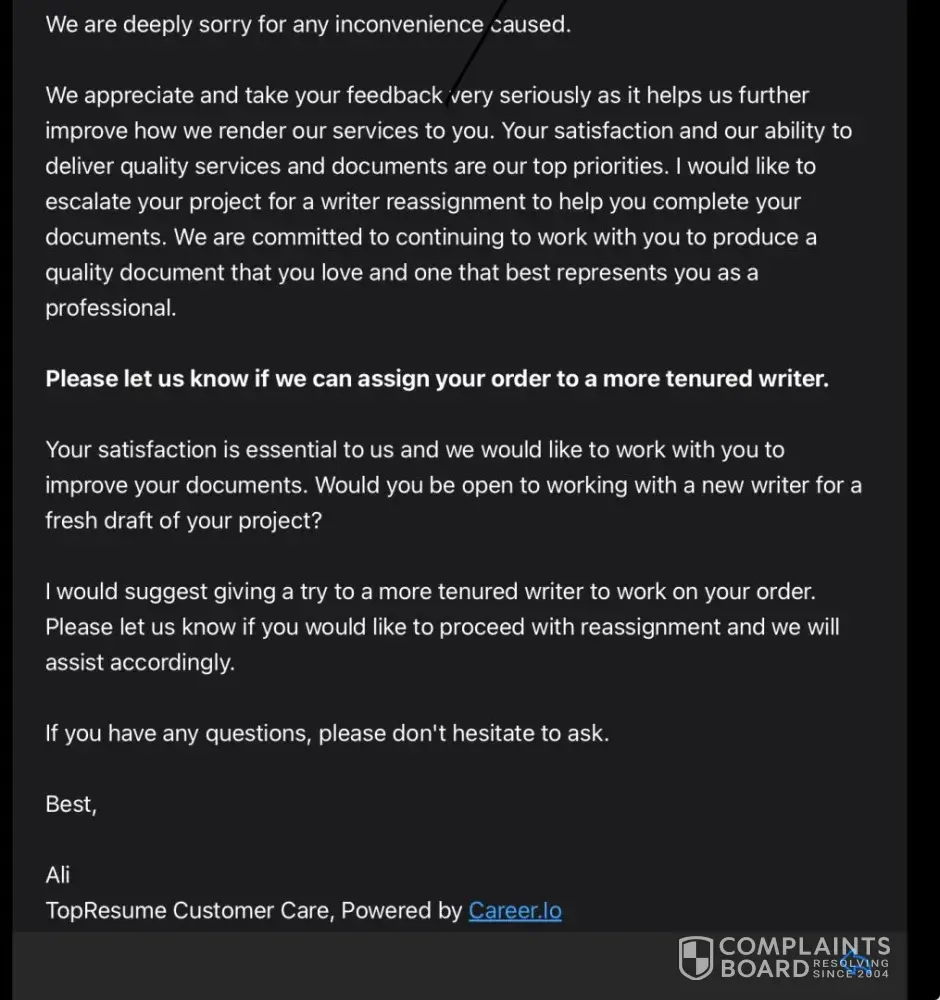 Having trouble getting a response from topcv at the moment when they are supposed to be working on my resume.