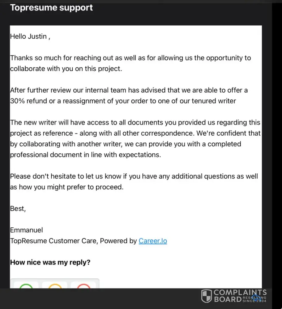 A full refund is a minimum to enable me to get on with life and move on from this negative experience. A never ending spiral of emails from support namely Rick S, Nolan, Monique, Amanda, Nikki and Simone adds further to the negative experience. The writer at a guess is from India and is incapable of writing an exec level document. Something that I have already paid for. Zero LinkedIn makeover carried out also which has been paid for. A note to the CEO Jeff Berger? Guess what zero response... must be great to take peoples money without a care in the world.