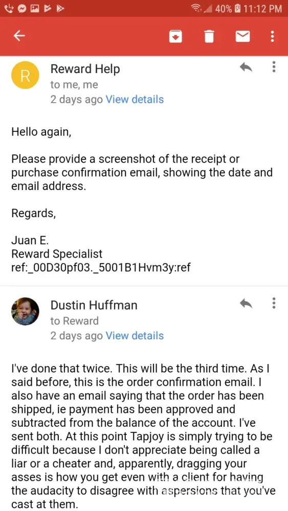 Since then, I have not received any contact. I attempted to contact again by replying to one of the emails they sent, as the offer for that game had been removed from my tapjoy account in my game — it was not listed as rewarded or not rewarded, it was just removed, along with many other unrewarded, incomplete offers. That email also went unanswered.