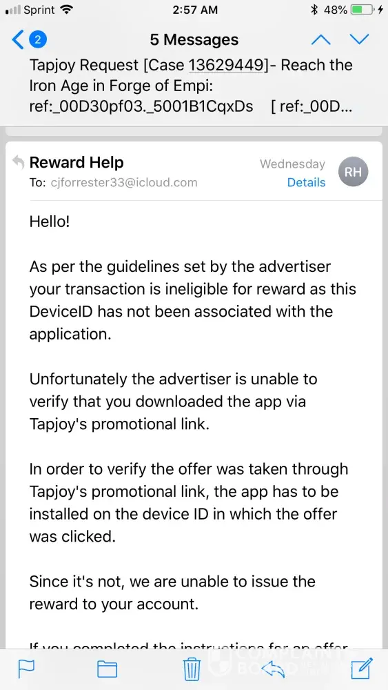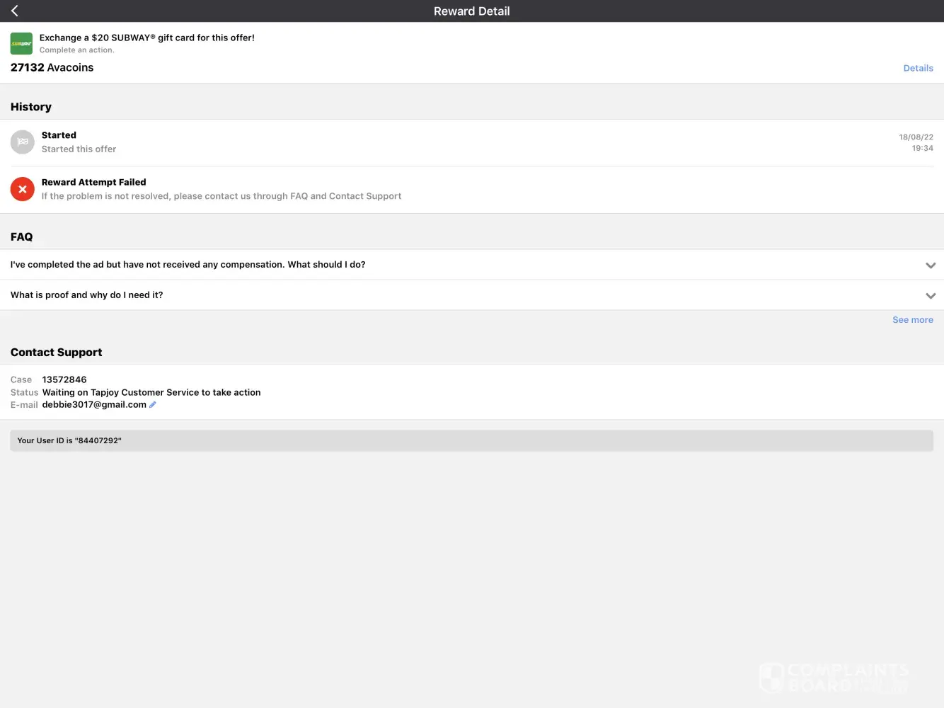 I completed an offer. The tapjoy app said I didn't. I have the email to prove it. My email is [protected]@gmail.com I have tried to contact support through the app but it is conveniently down right now and the reward will probably be removed from the app before it's up. I took screen shots of it though. I have tried everything Tapjoy sites tell me to do but nothing has worked. I also see that there are a bunch of complaints about this site on social media and the internet.