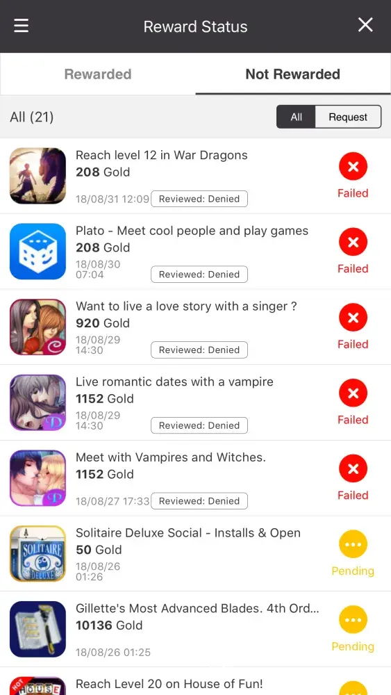 I've been playing this game and completing your offers for months now. I recently accidentally sent in a request for the same app twice. After doing that you guys have denied every request I have sent in even though they are all legit and this whole ting was caused by a mistake. I have sent proof for every offer I sent in but you guys will not respond to emails with the proof. It's really frustrating that you say everything is denied when you haven't even asked for proof like you normally do. I usually have no problem getting rewarded. Please help me resolve this as I am owed thousands of bars of gold from the game I'm playing and I've spent hours and money on the offers I've legitimately completed.
