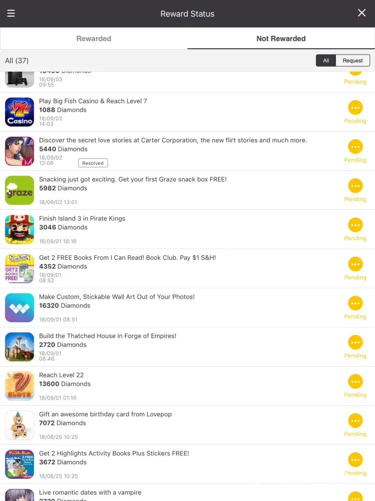 For the last week or so literally NONE of the offers are working for me. Not even the offers to watch a short video for 3-6 diamonds! I am having problems through both apps I play (covet fashion and taps to riches). No matter what I try none of the offers are being rewarded. I've done offers for downloading and running, downloading and starting a free trial and videos. All offers that don't require buying something because at this point I do not feel comfortable paying real money on an offer when I'm about 99% positive I will not be rewarded for it. What can I do at this point? I've done so many offers at this point hoping at some point it would start working again that it would take forever to send a ticket for every one of them!