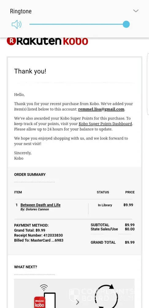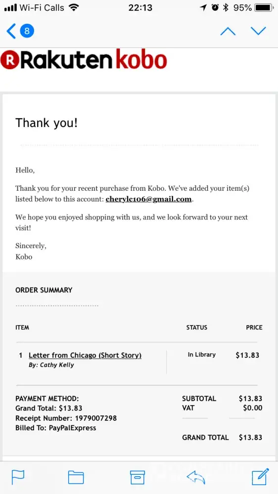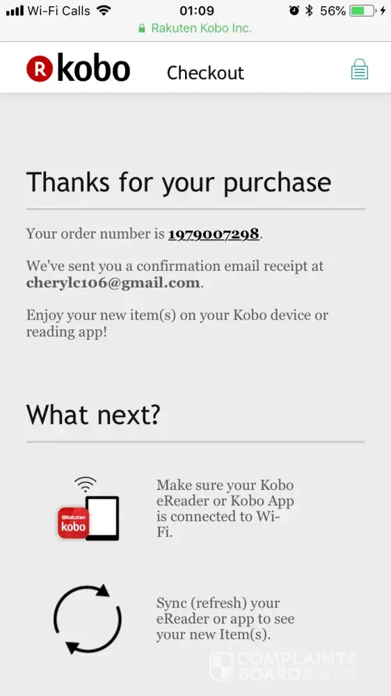 + KOBO 01 : Confirmation Screen Shot of my order on Kobo webpage