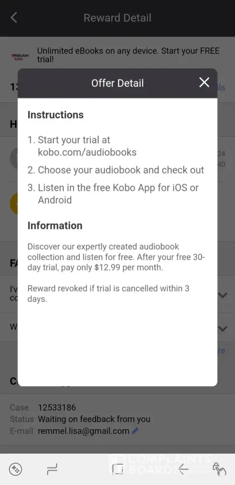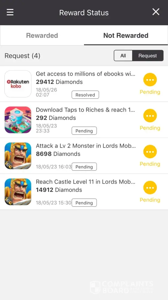 When the reward was finally back on, it was labeled with a status of "resolved" [ case no. [protected] / ref screen shot kobo 03 & kobo 04 ] therefore I was unable to send in any more request and was not paid with the Reward of 29412 Diamonds.
