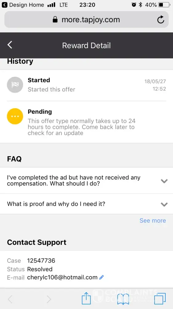 I would like to know how I go about talking to a supervisor who deals with tapjoy rewards please or I would like to know how I make a formal complaint as I completed 2 rewards oand provided screen shot for proof that I followed the instructions I received a reply from tapjoys automated email saying the developer who I was doing the one offer with said I had not completed the requirements so I messaged the game developers directly and have emails to show they say tapjoy never contacted them and I had completed the offer as I supplied screen shots of the completed level I had to reach now that offer that was pending in my list has gone. Â