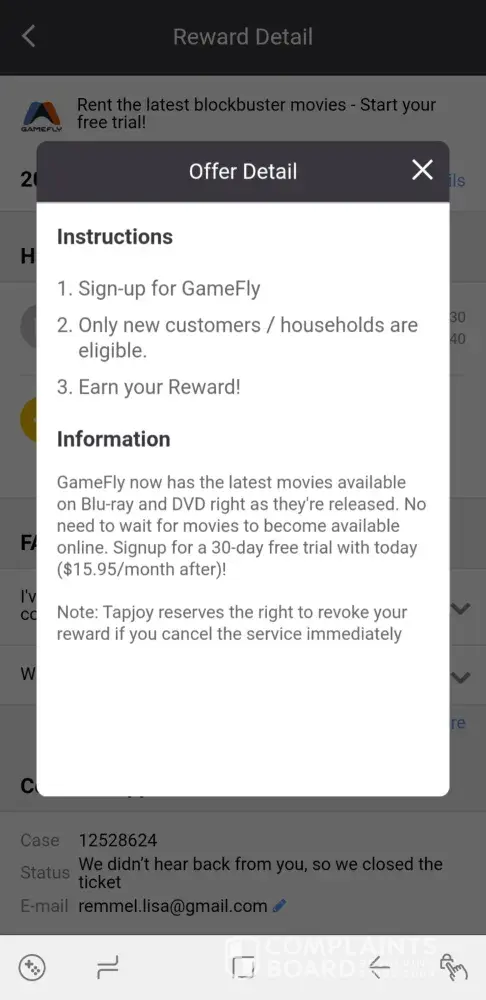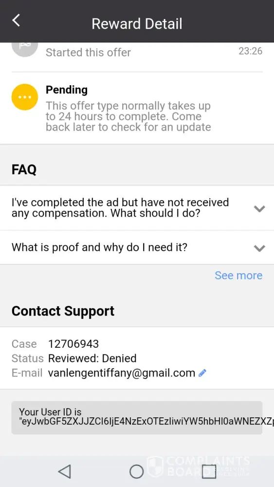 But after this the problems started, first I would complete the offers as the instructions stated, took screenshots just in case and waited longer than the required 24h or 36h. As nothing was happening I first tried to submit one customer support ticket to which I received an generic email requesting proof so I answered the email with the proof as requested only to be notified that I had email an unmonitored mailbox. Well at first I thought that was just normal, but 72 hours later they closed my ticket as I had not contacted them with the required proof. So I tried to do this to two other offers as well, the same thing happened, and they blocked my account as I was complaining too much, so one of my tickets is now permanently denied. Anywhere I have checked, I have not been able to find a direct email, only the unmonitored box which they claim I should email directly to.