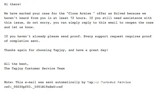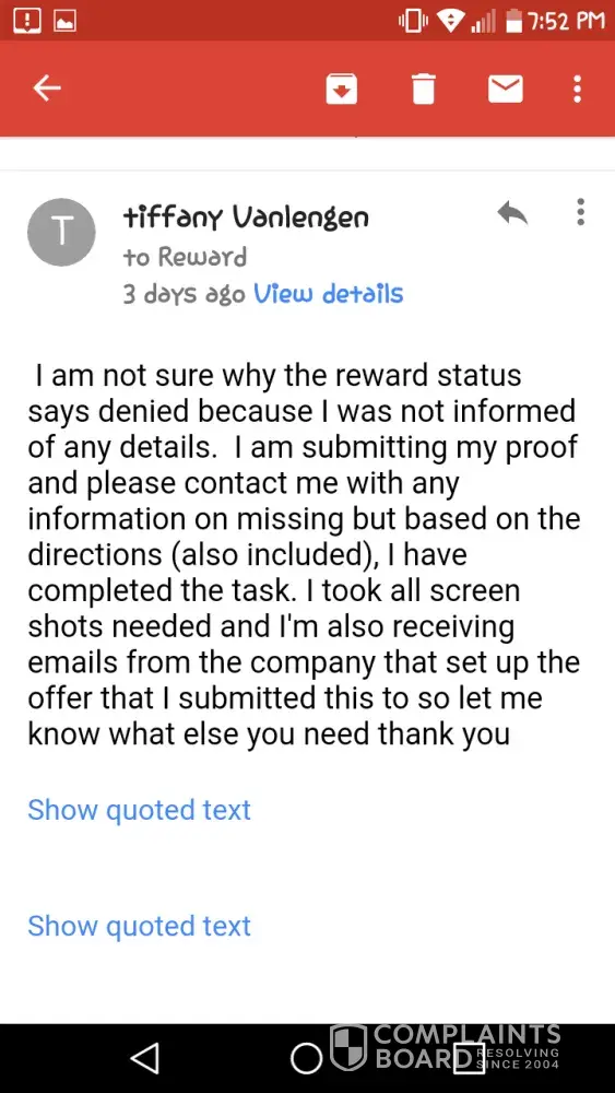 I completed 2 offers. I take screenshots of everything. Waited my 24 hrs for the request help to come up like normal. Automated email sent to me ft or both offers and immediately sent back proof of screenshots w info within 1 hour of receiving on 8/24/2018. 3 were submitted within a 24 he period and they came back w the 2 larger ones saying 4 days later. We have not heard back from you in 72 hrs, we are resolving your issue for that reason. Email says if any other questions please reply to email. I have replied 3 times to each email and GUESS WHAT no reply, no reward and even had to make purchases. I provided all screenshots and even in the email put info they requested just in case the screenshots fidnt go through as they've tried saying that before. Its always the same stories. They say make sure u have good internet connections. What about them having a good set up in place to complete these things. Some attorneys need to get together for all the people and sue them and actually the sites they use like design home.