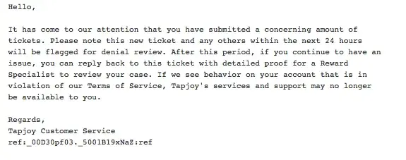 It's ridiculous, for the third time this month I have been locked out of Tapjoy for 24 hours because I submit an "alarming number of support requests."