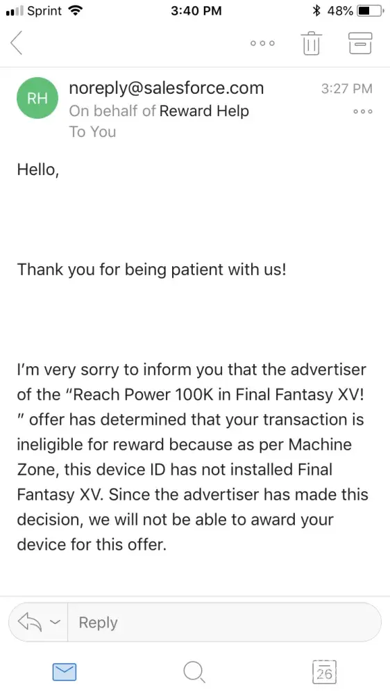 This company advertises an offer with WWE Champions in which a user must download and grow their empire to 100, 000 power level. Upon completing this action (which was a lot of wasted time somewhere around a week) I did not receive the reward. I filed a complaint with them which was not responded to until about another week. The email they sent informed me that they needed approval from the advertiser. I waited another two days only to receive an email stating that "per machine zone this device ID has not installed Final fantasy XV" which is blatantly false on their part. I have submitted several screen shots proving that the game is indeed installed on the same device in which I began this "scam/offer" and have yet to hear anything from tapjoy customer services. No reward, no sense of justice or gratification for my efforts, just a lot of wasted time and frustration when dealing with this company who seems to be some of the biggest scammers on mobile platforms according to many reviews i've read regarding their conduct. If you're reading this do not waste your time with their advertised offers as they will likely waste your time and you too will just be another notch on scamjoy's belt. If they fix this and make things right I'll certainly agree to write a review praising them, however, I won't hold my breath.