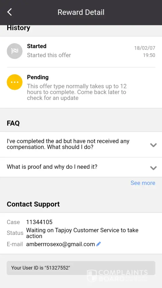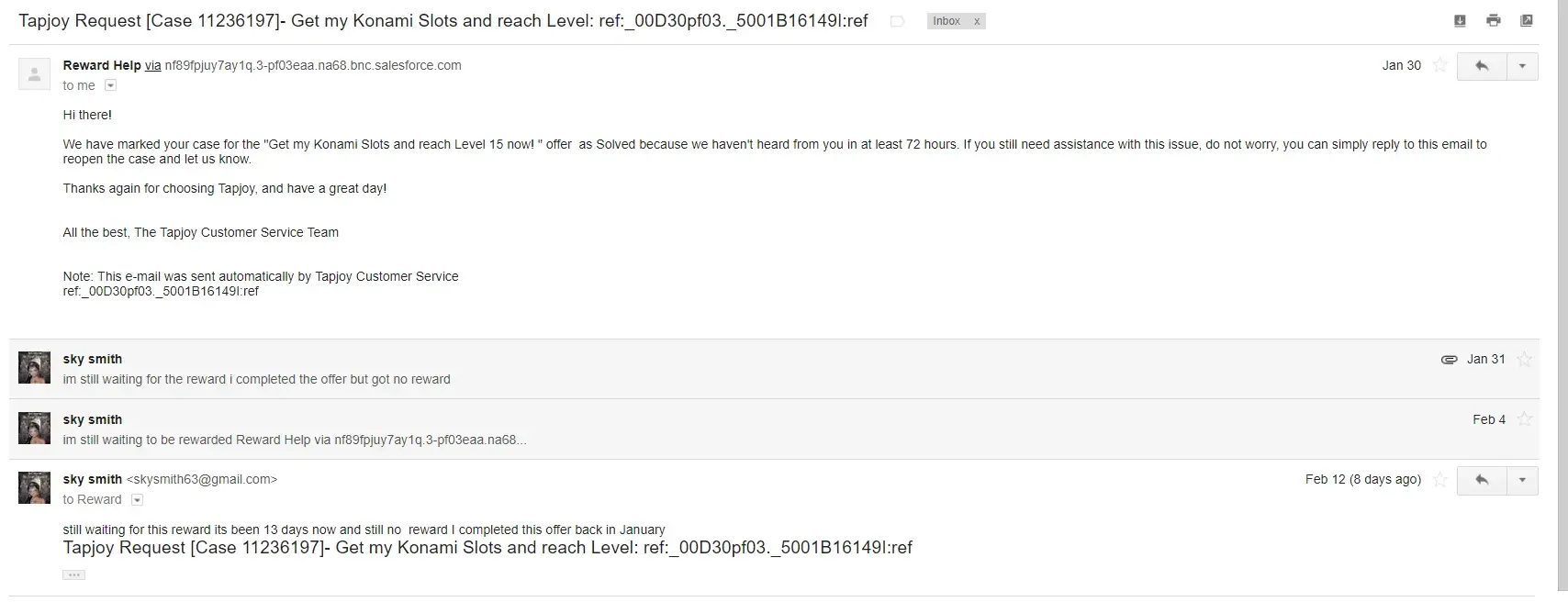 hello, i have been trying to get my reward for an offer i have completed for over a month now! It would not bother me so much if i did not spend real $$ in order to complete this offer. I have tried to go through the proper channels through the offerwall. They asked for 'proof', so i sent them a copy of my google receipt (included below) which shows the order date, order number, game name, and last 4 digits of the card that was used to make the purchase. What other 'proof' could they need? I got an email several days later stating that they recieved no proof, so i replied to that e-mail again providing the proof. I then received another email several days later stating they did not hear from me and were closing my case? I have since e mailed scopely and a few email addresses i found for tapjoy, scopely rsponded saying to go through the offerwall (UGH!), and no response from tapjoy. Below i have included a series of emails w/ tapjoy that should have my case number on it as well as the required 'proof' please tell me where i can go from here?