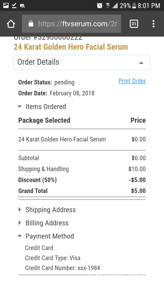 Order date: Jan 29, 2018 12:35:03 AM CST