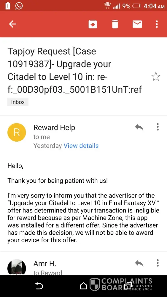 I have completed their two quests of leveling up citadel to level 6 and level 10 in final fantasy xv game, they didn't reward me for reaching level 6 in the name of my bad connection and I emailed them, after that I reached level 10 citadel and emailed them after two days they ignore it for two weeks and then they say the advertiser didn't accept it cause the install was for the level 6, however I registered for both quests.