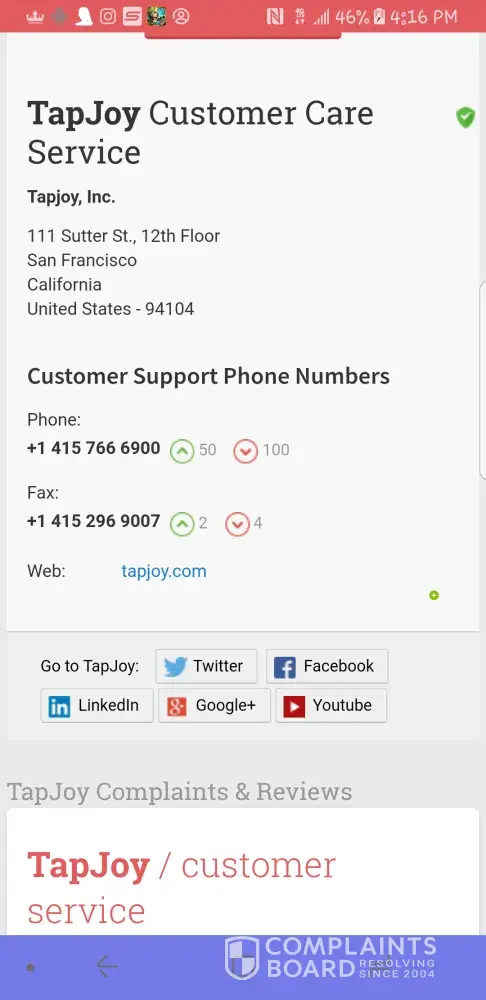 TapJoy phone numbersClick up if you have successfully reached TapJoy by calling +1 (415) 766-6900 phone number 0 0 users reported that they have successfully reached TapJoy by calling +1 (415) 766-6900 phone number Click down if you have unsuccessfully reached TapJoy by calling +1 (415) 766-6900 phone number 2 2 users reported that they have UNsuccessfully reached TapJoy by calling +1 (415) 766-6900 phone numberClick up if you have successfully reached TapJoy by calling +1 (415) 766-6905 phone number 2 2 users reported that they have successfully reached TapJoy by calling +1 (415) 766-6905 phone number Click down if you have unsuccessfully reached TapJoy by calling +1 (415) 766-6905 phone number 19 19 users reported that they have UNsuccessfully reached TapJoy by calling +1 (415) 766-6905 phone number