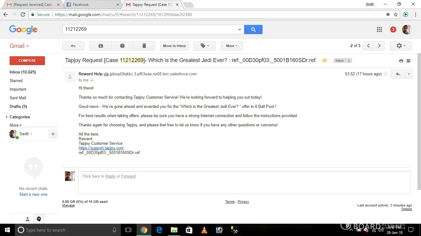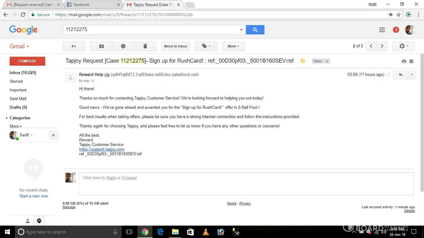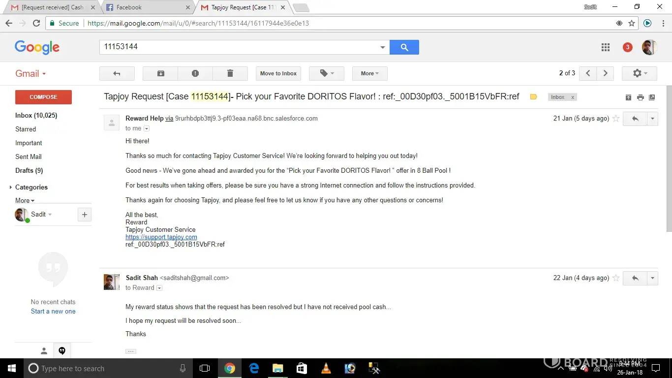 since 5 jan 2018-no case id created after submitted via tap joy customer support.