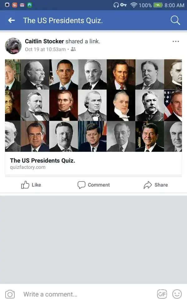 *U. S. presidents quiz - completed quiz, shared on favebook, no diamonds